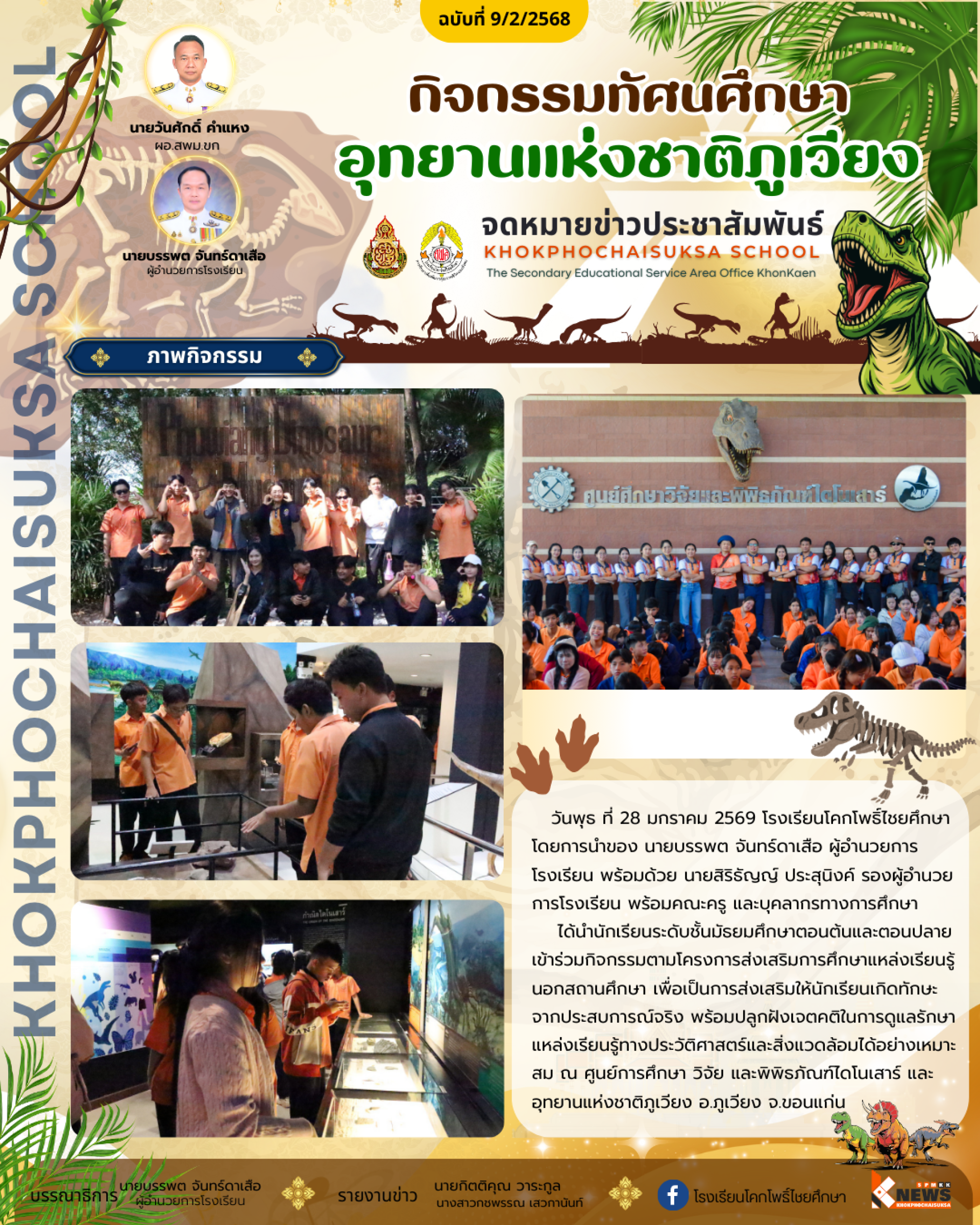 โรงเรียนโคกโพธิ์ไชยศึกษา โดยการนำของ นายบรรพต จันทร์ดาเสือ ผู้อำนวยการโรงเรียน พร้อมด้วย นายสิริธัญญ์ ประสุนิงค์ รองผู้อำนวยการโรงเรียน พร้อมคณะครู และบุคลากรทางการศึกษา ได้นำนักเรียนระดับชั้นมัธยมศึกษาตอนต้นและตอนปลาย เข้าร่วมกิจกรรมตามโครงการส่งเสริมการศึกษาแหล่งเรียนรู้นอกสถานศึกษา เพื่อเป็นการส่งเสริมให้นักเรียนเกิดทักษะจากประสบการณ์จริง พร้อมปลูกฝังเจตคติในการดูแลรักษาแหล่งเรียนรู้ทางประวัติศาสตร์และสิ่งแวดล้อมได้อย่างเหมาะสม ณ ศูนย์การศึกษา วิจัย และพิพิธภัณฑ์ไดโนเสาร์ และอุทยานแห่งชาติภูเวียง อ.ภูเวียง จ.ขอนแก่น
