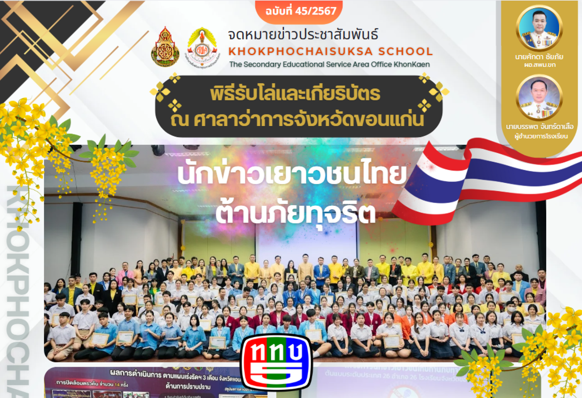 วันจันทร์ ที่ 16 ธันวาคม 2567 โรงเรียนโคกโพธิ์ไชยศึกษา โดยการนำของ นายบรรพต จันทร์ดาเสือ ผู้อำนวยการโรงเรียน พร้อมด้วย นายสิริธัญญ์ ประสุนิงค์ รองผู้อำนวยการโรงเรียน ครู และนักเรียน เข้ารับโล่รางวัลและเกียรติบัตร จาก พลตำรวจเอกเพิ่มพูน ชิดชอบ รมต.ว่าการกระทรวงศึกษาธิการ และ รับโล่จากนายไกรสร กองฉลาด ผู้ว่าราชการจังหวัดขอนแก่น "โครงการนักข่าวเยาวชนไทยต้านภัยทุจริต" ต้นแบบระดับประเทศ 1 อำเภอ 1 โรงเรียน ณ หอประชุมแก่นเมือง ศาลากลางจังหวัดขอนแก่น โดยมีนายกิตติคุณ วาระกูล และนางสาวพิรุณรัตน์ แก้วสุพรรณ เป็นที่ปรึกษา