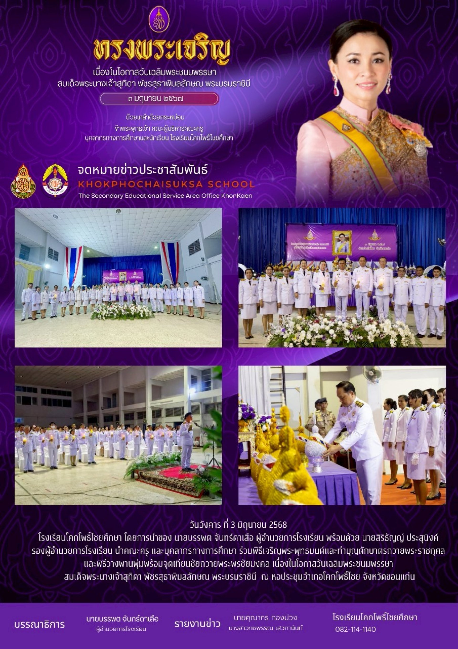 โรงเรียนโคกโพธิ์ไชยศึกษา โดยการนำของ นายบรรพต จันทร์ดาเสือ ผู้อำนวยการโรงเรียน พร้อมด้วย นายสิริธัญญ์ ประสุนิงค์ รองผู้อำนวยการโรงเรียน นำคณะครู และบุคลากรทางการศึกษา ร่วมพิธีเจริญพระพุทธมนต์และทำบุญตักบาตรถวายพระราชกุศล และพิธีวางพานพุ่มพร้อมจุดเทียนชัยถวายพระพรชัยมงคล เนื่องในโอกาสวันเฉลิมพระชนมพรรษา สมเด็จพระนางเจ้าสุทิดา พัชรสุธาพิมลลักษณ พระบรมราชินี ณ หอประชุมอำเภอโคกโพธิ์ไชย จังหวัดขอนแก่น