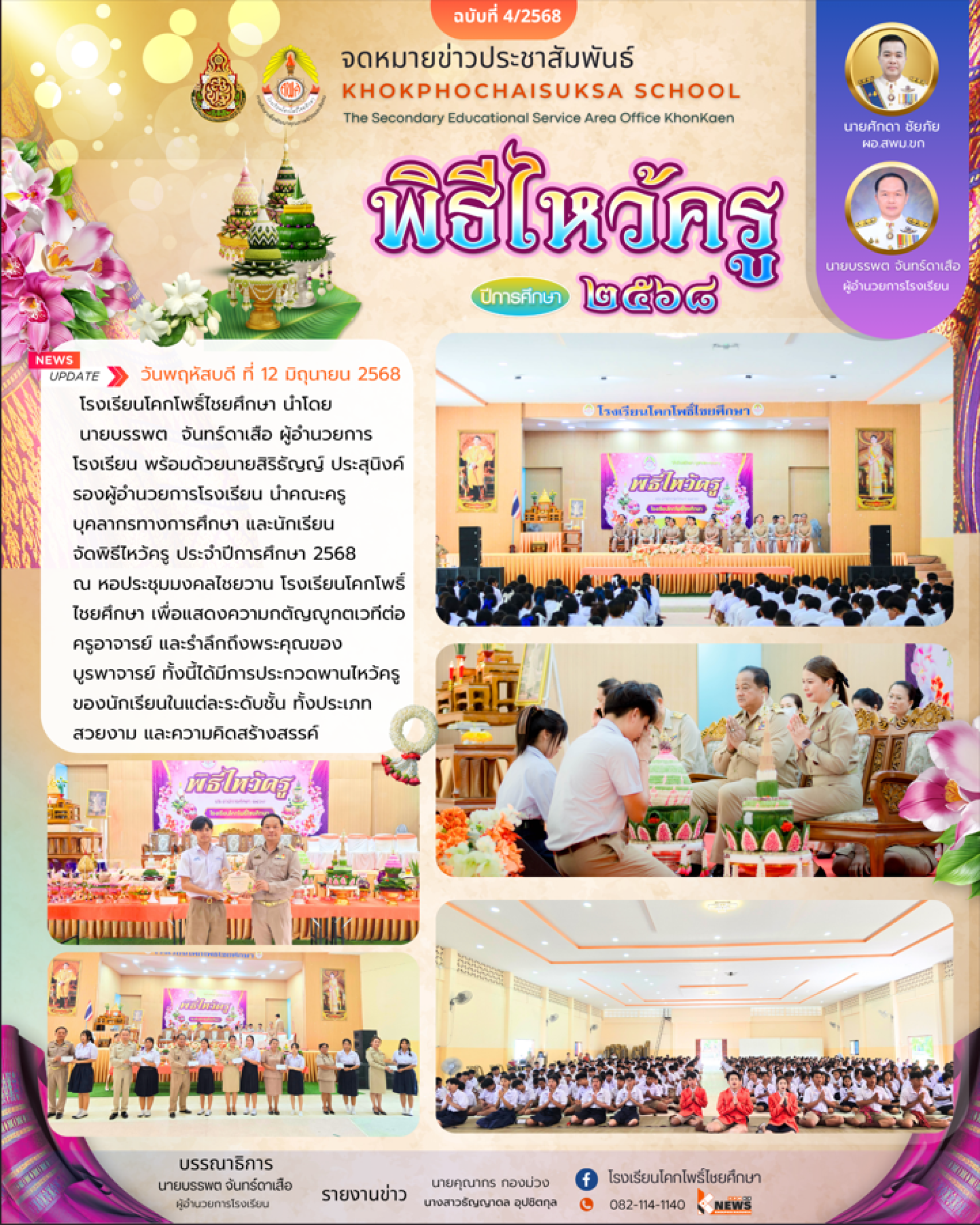 วันพฤหัสบดี ที่ 12 มิถุนายน 2568 โรงเรียนโคกโพธิ์ไชยศึกษา นำโดยนายบรรพต จันทร์ดาเสือ ผู้อำนวยการโรงเรียน พร้อมด้วยนายสิริธัญญ์ ประสุนิงค์ รองผู้อำนวยการโรงเรียน นำคณะครู บุคลากรทางการศึกษา และนักเรียน จัดพิธีไหว้ครู ประจำปีการศึกษา 2568 ณ หอประชุมมงคลไชยวาน โรงเรียนโคกโพธิ์ไชยศึกษา เพื่อแสดงความกตัญญูกตเวทีต่อครูอาจารย์ และรำลึกถึงพระคุณของบูรพาจารย์ ทั้งนี้ได้มีการประกวดพานไหว้ครูของนักเรียนในแต่ละระดับชั้น ทั้งประเภทสวยงาม และความคิดสร้างสรรค์