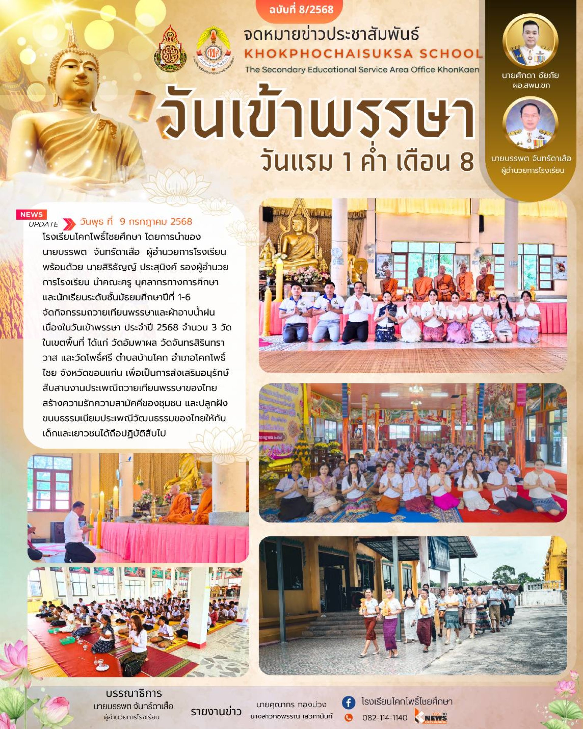โรงเรียนโคกโพธิ์ไชยศึกษา โดยการนำของ นายบรรพต จันทร์ดาเสือ ผู้อำนวยการโรงเรียน พร้อมด้วย นายสิริธัญญ์ ประสุนิงค์ รองผู้อำนวยการโรงเรียน นำคณะครู บุคลากรทางการศึกษา และนักเรียนระดับชั้นมัธยมศึกษาปีที่ 1-6 จัดกิจกรรมถวายเทียนพรรษาและผ้าอาบน้ำฝน เนื่องในวันเข้าพรรษา ประจำปี 2568 จำนวน 3 วัด ในเขตพื้นที่ ได้แก่ วัดอัมพาผล วัดจันทรสิรินทราวาส และวัดโพธิ์ศรี ตำบลบ้านโคก อำเภอโคกโพธิ์ไชย จังหวัดขอนแก่น เพื่อเป็นการส่งเสริมอนุรักษ์ สืบสานงานประเพณีถวายเทียนพรรษาของไทย สร้างความรักความสามัคคีของชุมชน และปลูกฝังขนบธรรมเนียมประเพณีวัฒนธรรมของไทยให้กับเด็กและเยาวชนได้ถือปฏิบัติสืบไป